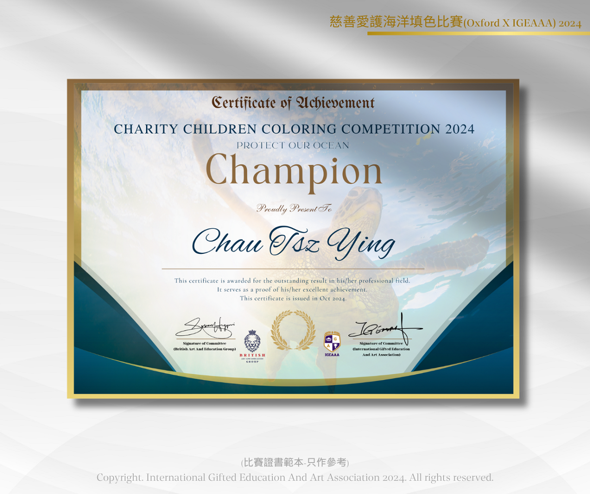 ※ 得獎證書由英國藝術機構British Art And Education Group簽發