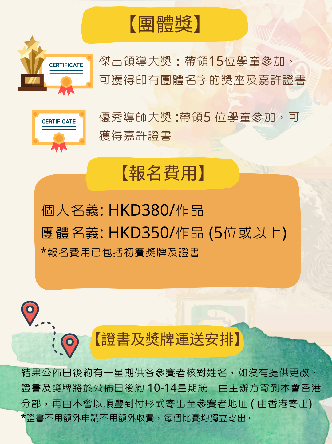 *****************************************************************************比賽Q&A:問: 請問同一幅作品是否可以參加不同比賽?答: 由於由IGEAAA組織的比賽的主辦單位及評審均不相同,參賽者可以同一作品同時參加本會的不同比賽。問: 作品有限制嗎?答: 繪畫內容不限,唯不接受色情及暴力材題。問: 實體作品需要郵寄嗎?答: 不需要,由於比賽為線上比賽,為免作品經郵寄運輸而有損原作,請參賽者自行保留原作,提交作品時正面拍攝作品,以電子檔形式JPG上載至[作品上載系統]。問: 作品電子檔有限像素及檔案類型嗎?答: 一般以智能電話拍攝的相片像素已足夠,如有不足,本會將直接聯繫參賽者重新提供。檔案類型為JPG/JPEG。