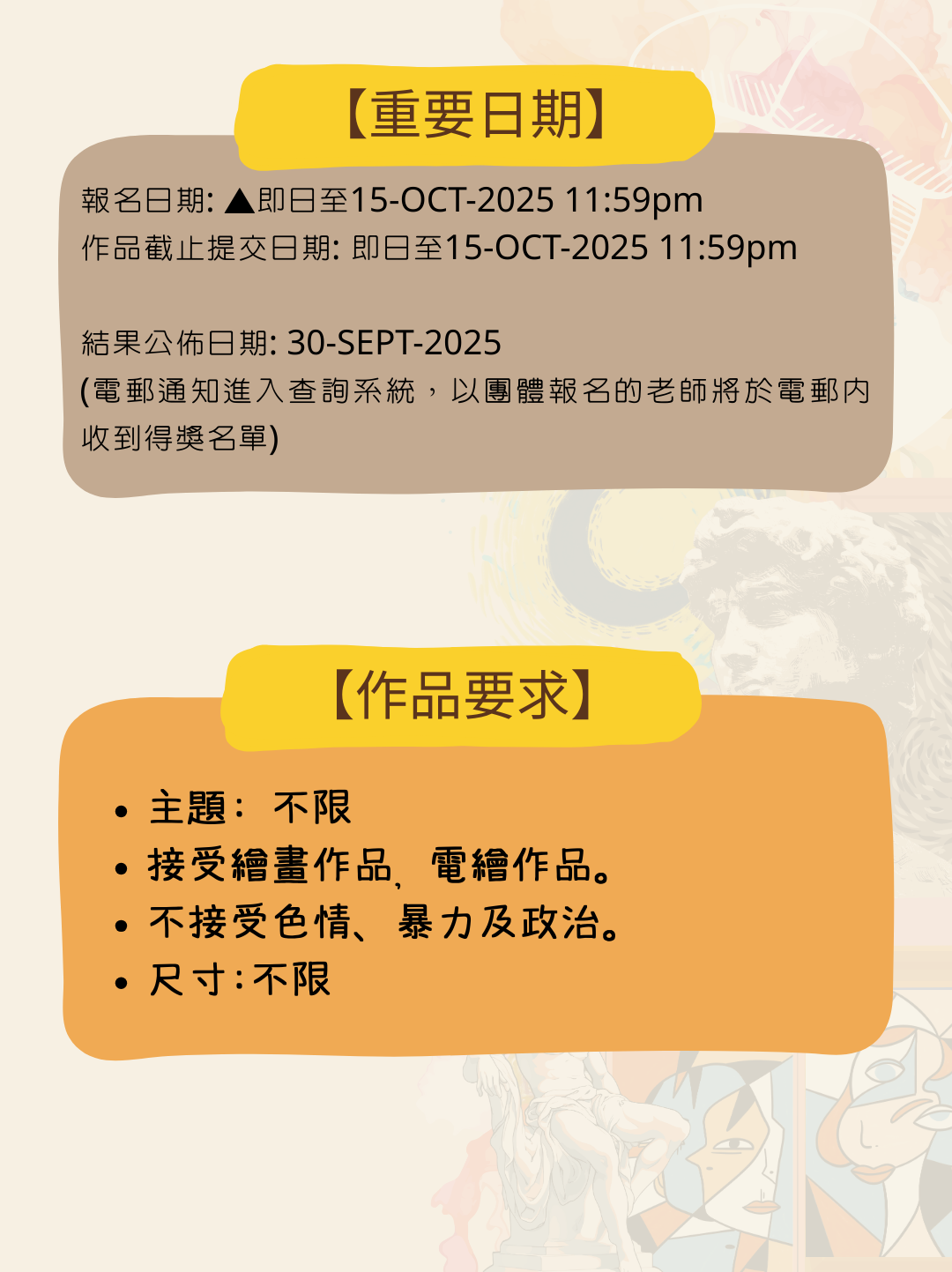 報名日期: ▲即日至15-OCT-2025 11:59pm 公佈日: 暫定30-OCT-2025