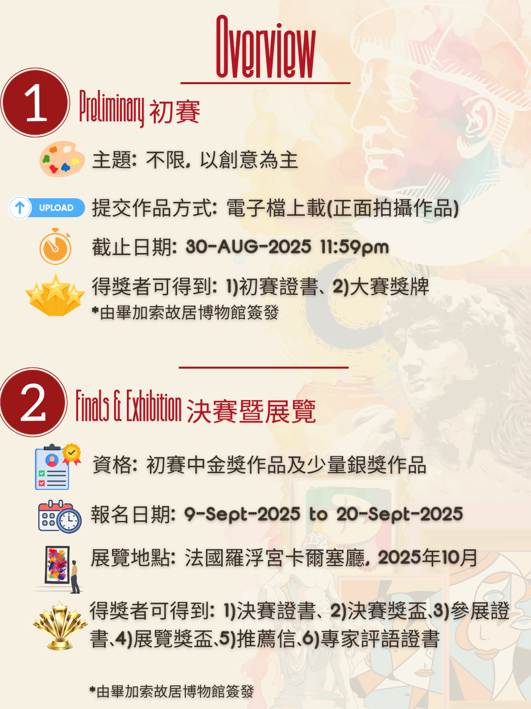 決賽暨展覽:設有1)決賽證書、2)決賽獎盃、3)羅浮宮參展證書、4)專家評語證書、5)推薦信、6)參展獎盃
