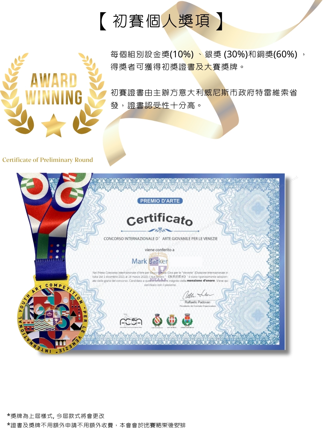 第一階段(初賽): 設有初賽證書、獎牌